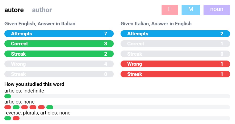 At this point, I felt I built a better list, and a better flashcard tool. The final thing I wanted out of a tool was to be able to quickly visualize my progress and see my gaps from a bird’s eye perspective. To solve this, each time a study session was completed, I would track various stats. This information included which modifiers I used to study those words, if I was prompted in Italian and answered in English or the other way around, and my answer history over time. Using all this data, I was able to create various visualizations which can highlight the good, the bad, and the ugly. This is what pen and paper could never achieve and what general-purpose flashcard apps didn’t offer me as well.